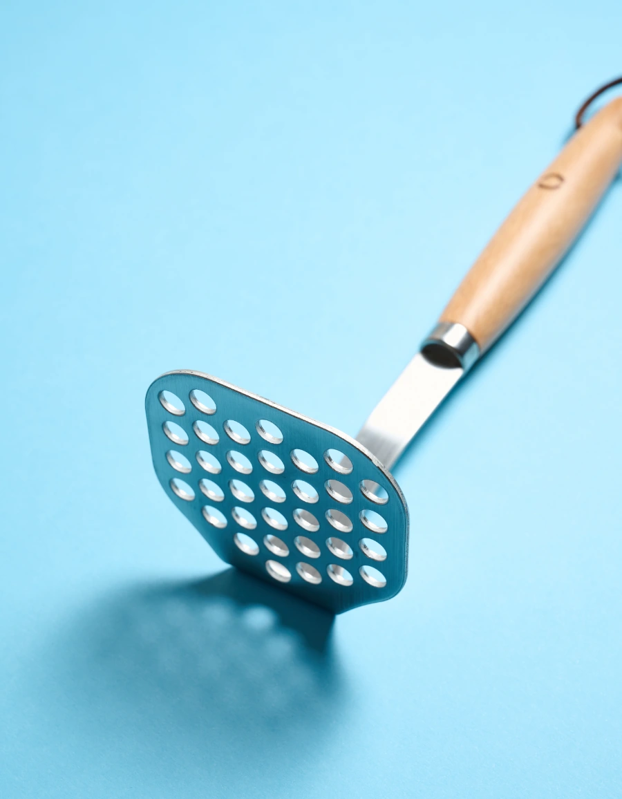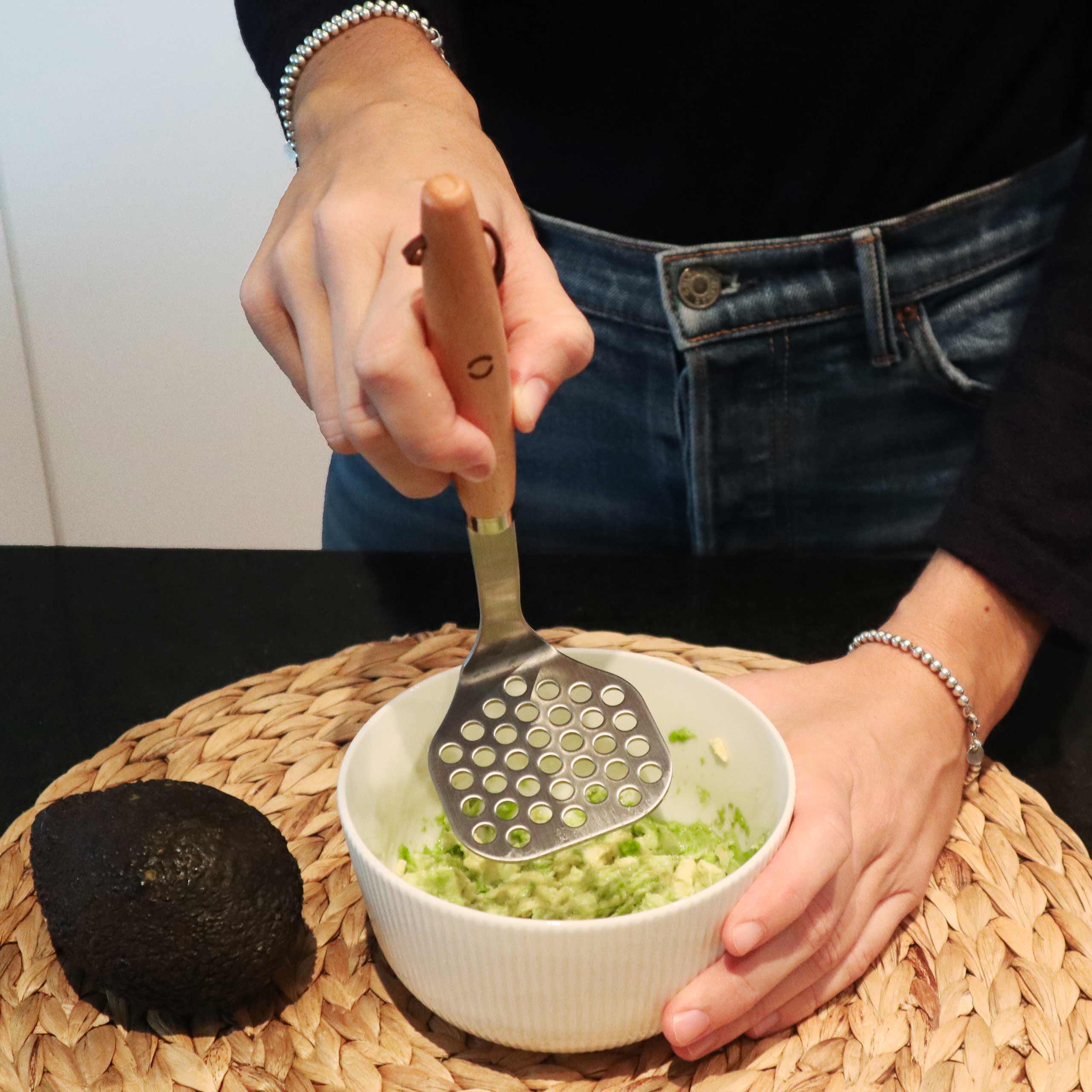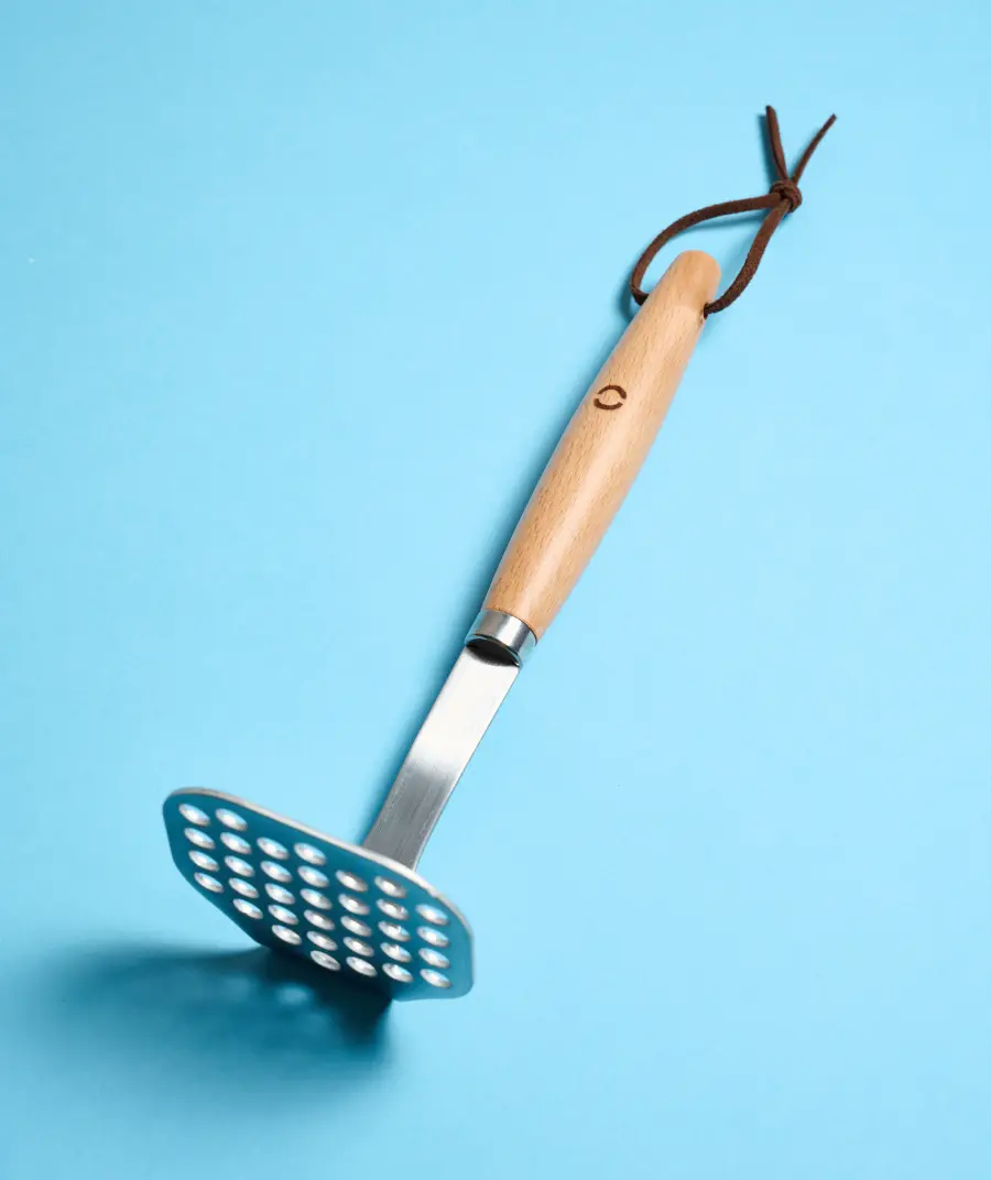 Potato or other food press, which combines the resistance and advantages of stainless steel in the kitchen with the touch of modern and sustainable design that the wooden handle gives it. In addition, the rounded handle provides a greater and more comfortable grip.