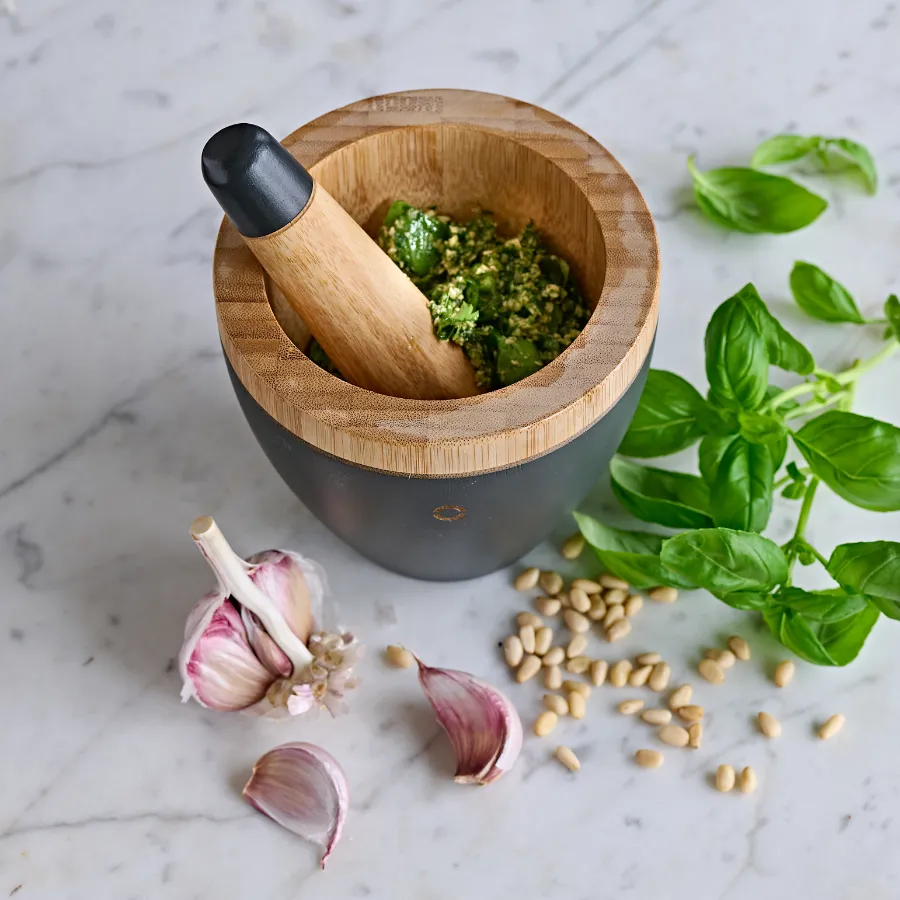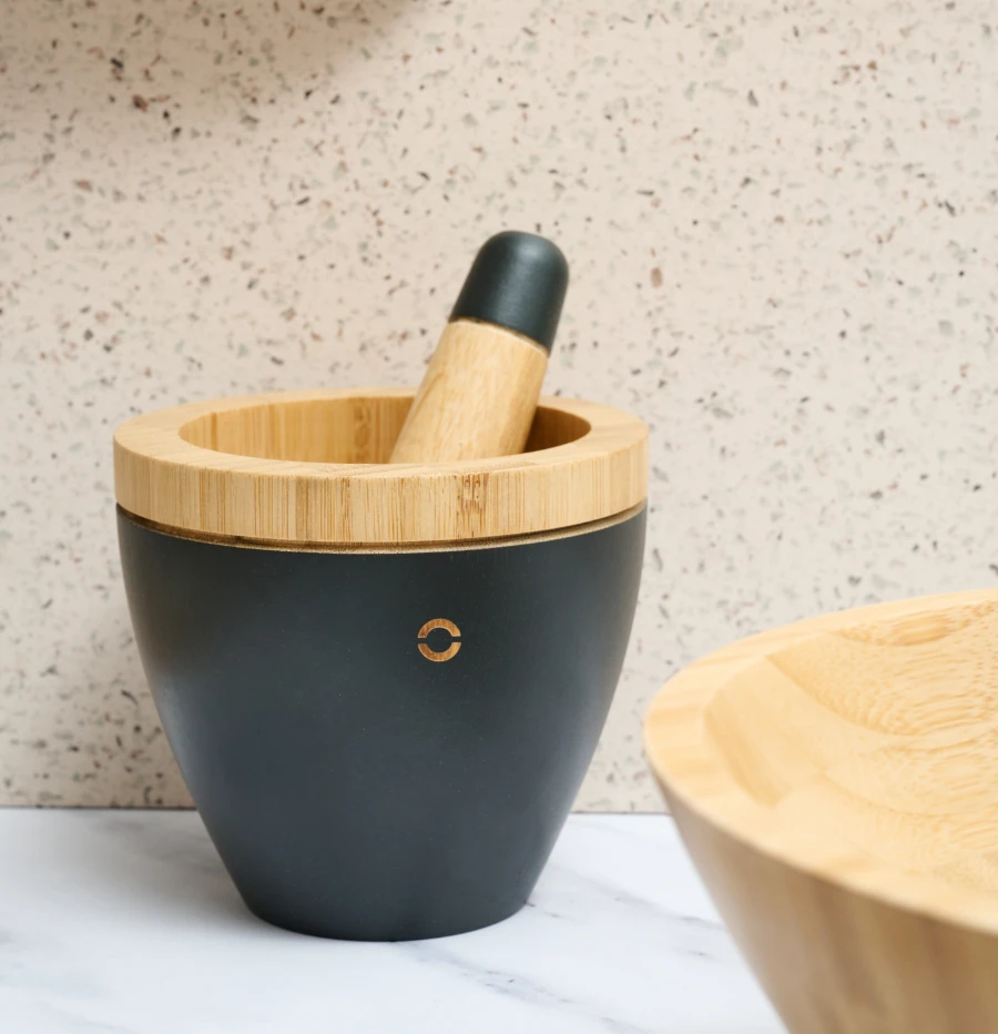 The mortar, with its pestle, is an essential ally in the kitchen. With this bamboo wood mortar, anthracite color and minimalist design you can easily crush all kinds of herbs, spices, seeds! or whatever comes to mind!