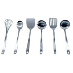 This pack includes a ladle, a pasta serving spoon, a serving spoon, a spatula, a whisk, and a flat spatula.