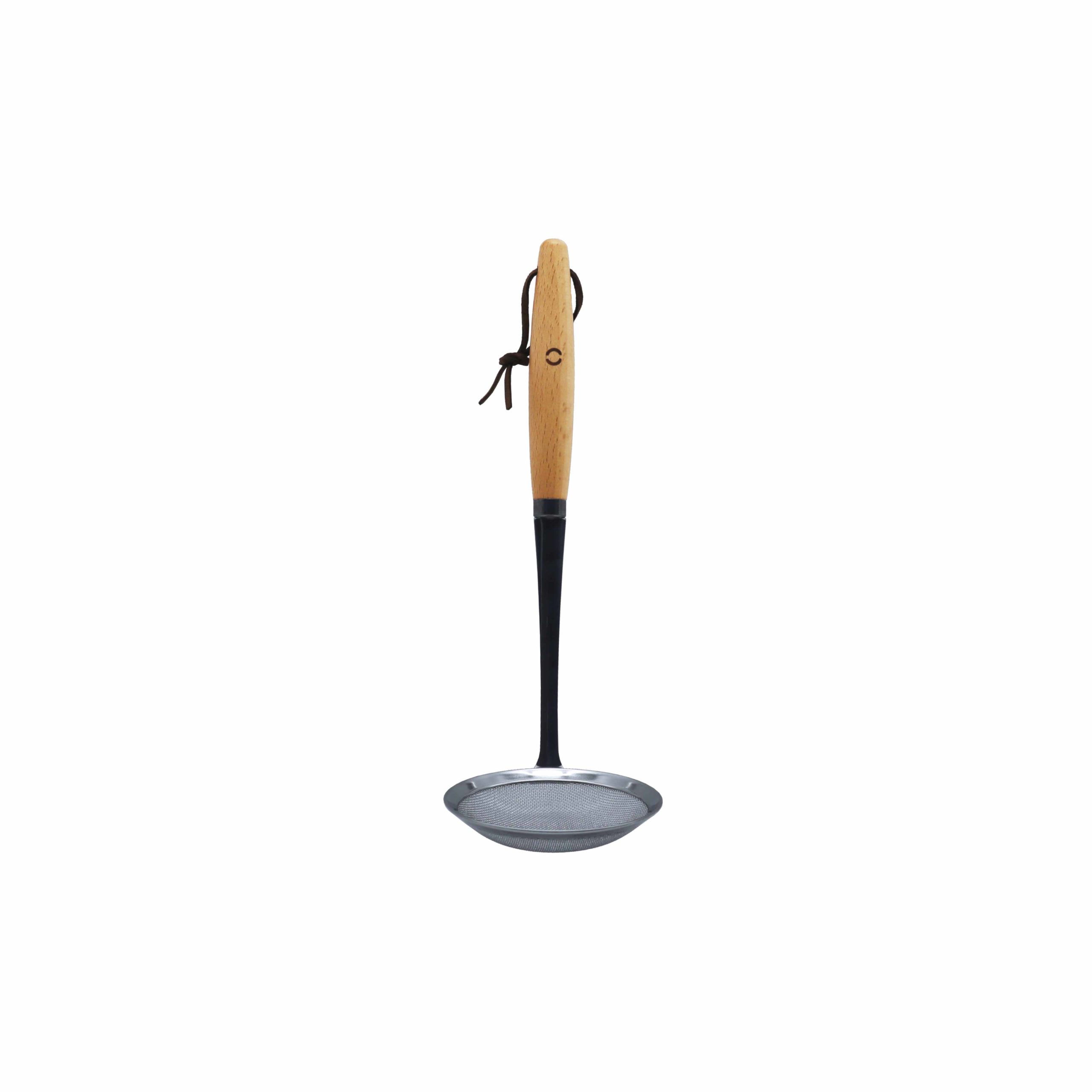 Espumadera de malla ultra fina, plana que combina la resistencia del acero inoxidable junto con el diseño del mango de madera de haya, redondeado para un agarre más cómodo y a una distancia perfecta para tener control sobre el utensilio sin estar demasiado cerca del calor de la cocción.