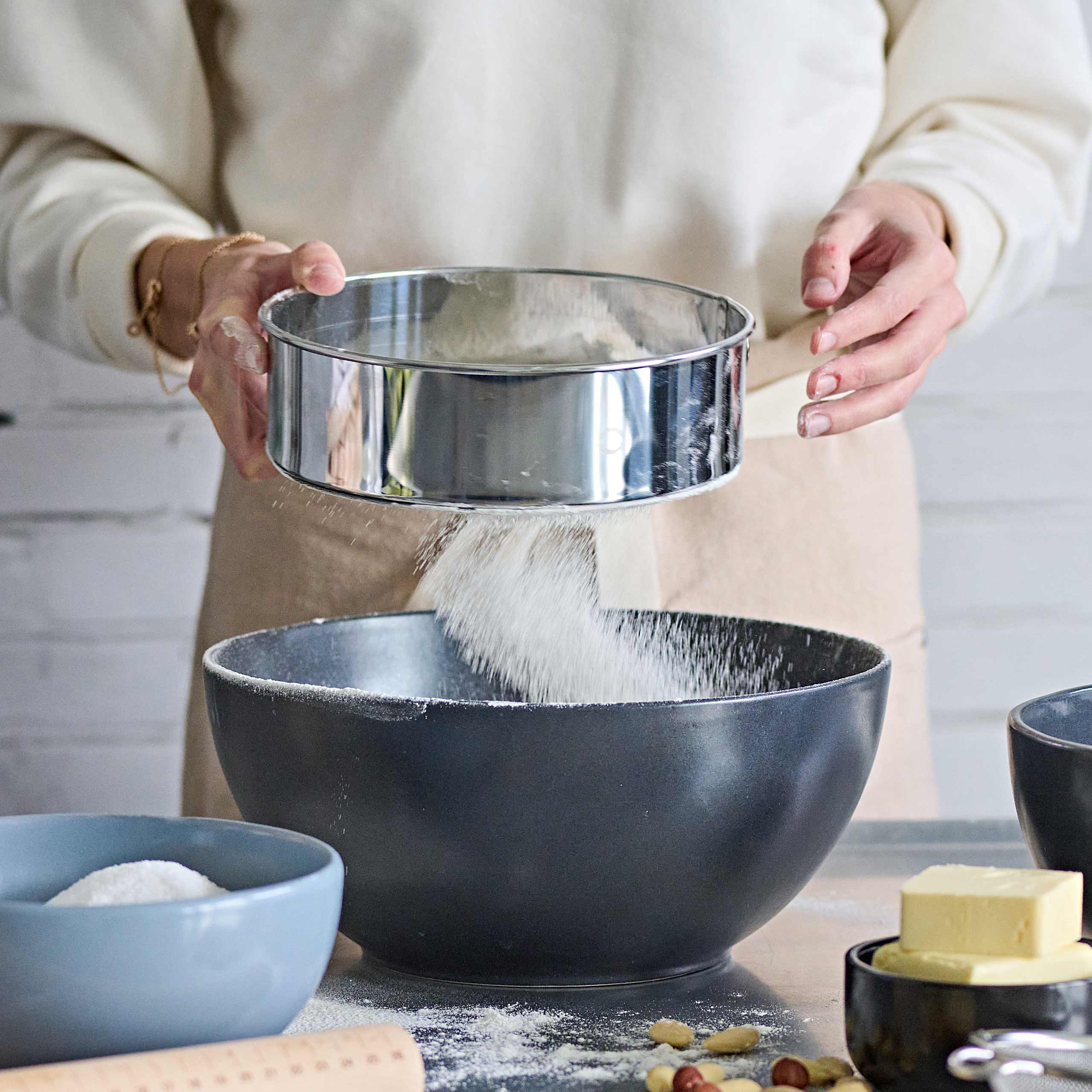 La superficie amplia de este tamizador y sus paredes no muy altas, no solo facilita y acelera el proceso, sino que además lo convierten en un utensilio versátil y multiusos, con el que no solo podrás tamizar sino que también podrás rebozar, empanar o escurrir.