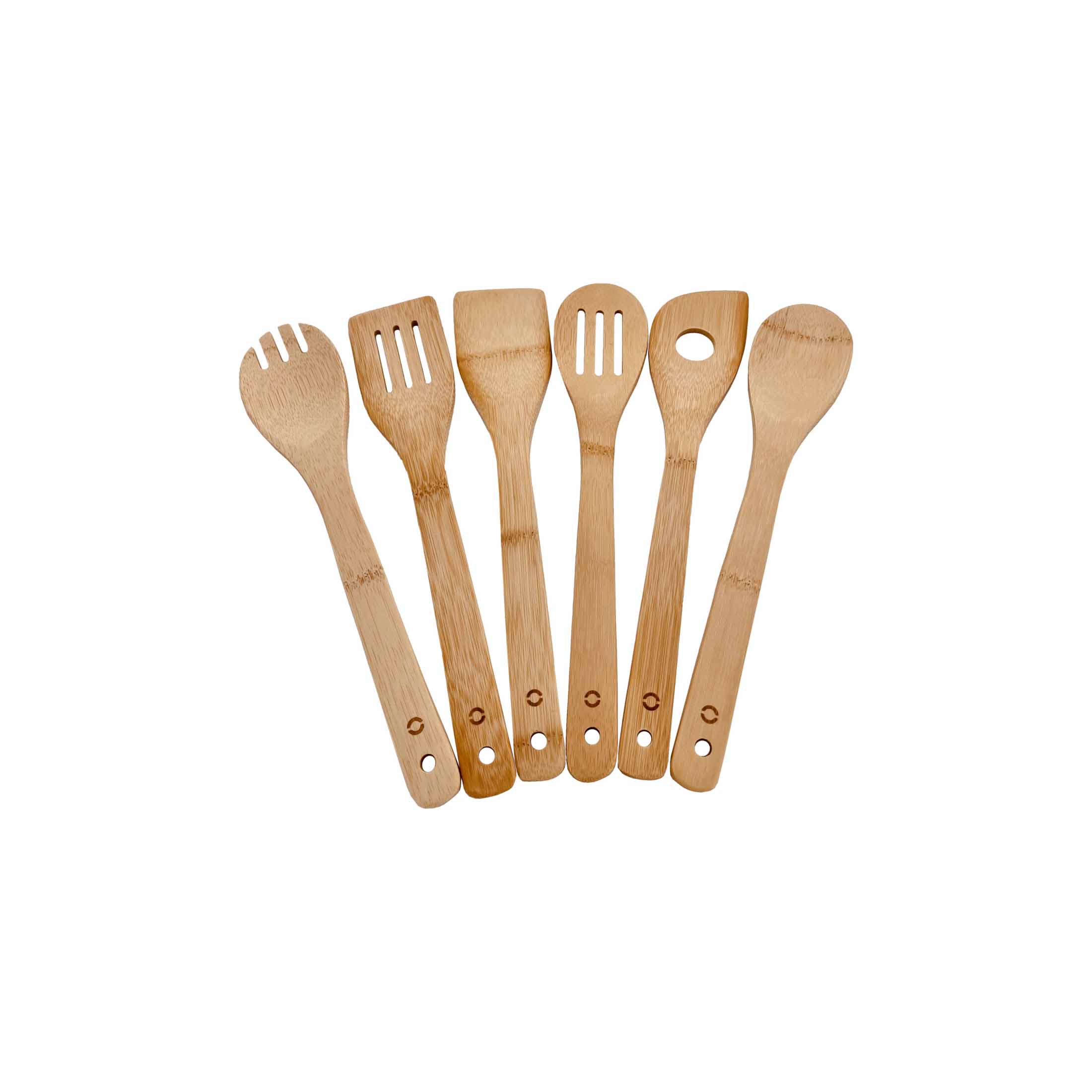 Este set de utensilios de cocina de madera de bambú incluye una espátula lisa, una espátula ranurada, una cuchara lisa, una cuchara ranurada, un tenedor y una cuchara con agujero. Todo lo que necesitas para tu cocina del día a día.